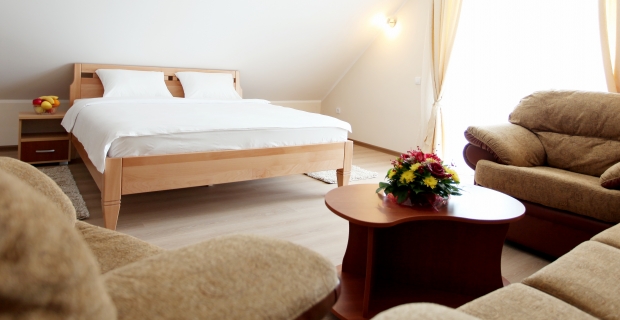 The Junior Suite has a large 220x200 cm double bed, a sofa set, a large balcony, a TV set, cable television with more than 70 channels, a hair drier, telephone, free Wi-Fi.